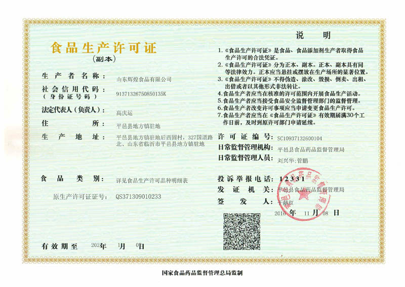 輝煌介紹,          山東輝煌食品有限公司始創(chuàng)于1998年,是一家集研發(fā)、生產、銷售、出口貿易為一體的現(xiàn)代化重點龍頭企業(yè)。公司以“互利共贏,基業(yè)長青”的經營理念為指引,在不斷鞏固和發(fā)展罐頭產業(yè)的基礎上,已逐步成長為涉及金融、電商、酒店等產業(yè)的綜合性公司。 公司技術先進,裝備優(yōu)良,建有市級企業(yè)技術中心及臨沂市“果醬及水果罐頭加工工程實驗室“,2021年被認定為”山東省‘專精特新’中小企業(yè)“。產品在占領國內市場的同時,遠銷歐、美、日、俄、蒙古等國家和地區(qū)。 公司始終堅持以市場為導向,以質量求生存。先后通過了ISO、BRC、IFS等國際認證,被評為“消費者滿意單位”、 “最具競爭力中小企業(yè)·百強企業(yè)”,2014年被央視商城評為“中國好物種”,2018年山東省食安辦授予“食安山東·生產加工示范企業(yè)”,并先后獲得“省級守合同重信用企業(yè)”、“山東省著名商標”、“中國罐藏食品領先品牌”等榮譽稱號。 潮平兩岸闊,風正一帆懸。輝煌人正以堅定的信念、昂揚的斗志,秉承“創(chuàng)百年大品牌,造中國好罐頭”的宗旨,堅持“專注穩(wěn)健,務實高效”的企業(yè)作風,致力于“做中國罐頭行業(yè)持續(xù)領先企業(yè)”的輝煌愿景!